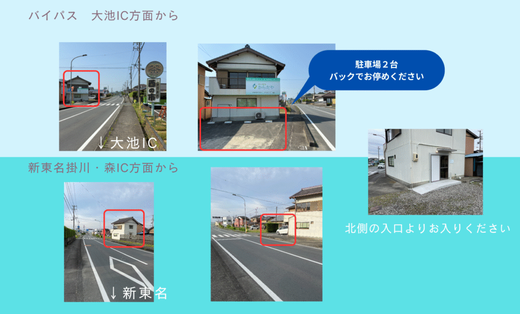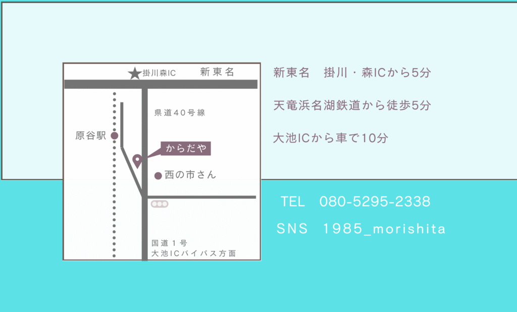 ACCESSアクセス 静岡県掛川市本郷24-2お車でお越しの方 ・新東名高速「掛川IC」より南へ約10分・「県道40号線」本郷交差点付近・駐車場あり(無料・10台程度) ※ナビで「掛川市本郷24-2」と入力するとスムーズです。 公共交通機関をご利用の方 ・JR東海道本線「掛川駅」よりタクシーで約15分・または掛川駅から「しずてつジャストライン(バス)」乗車 →「本郷」バス停下車 徒歩2分 駐車場